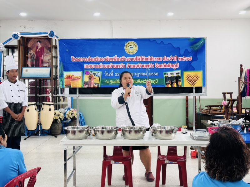 นายธวัช จินชัย นายกเทศมนตรีตำบลบ้านเขว้า มอบหมายให้กองสวัสดิการสังคมได้ดำเนินการจัดโครงการส่งเสริมอาชีพเพื่อสร้างรายได้ให้แก่ประชาชน ประจำปี ๒๕๖๘ โดยได้รับความอนุเคราะห์วิทยากรให้ความรู้จากวิทยาลัยอาชีวศึกษาเมืองชัยภูมิ จัดอบรม ณ ศูนย์ส่งเสริมผ้าไหมจังหวัดชัยภูมิ เทศบาลตำบลบ้านเขว้า อ.บ้านเขว้า จ.ชัยภูมิ