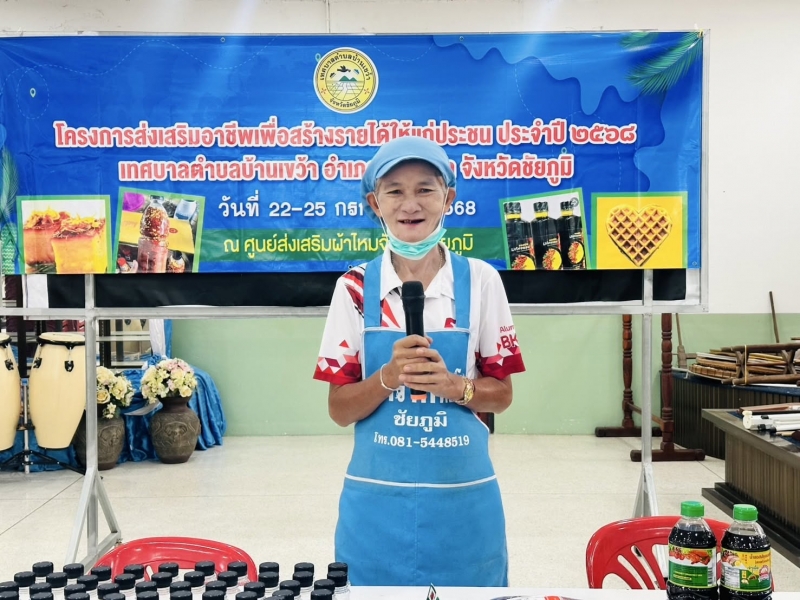 นายธวัช จินชัย นายกเทศมนตรีตำบลบ้านเขว้า มอบหมายให้กองสวัสดิการสังคมดำเนินการจัดโครงการส่งเสริมอาชีพเพื่อสร้างรายได้ให้แก่ประชาชน ประจำปี ๒๕๖๘ โดยได้รับความอนุเคราะห์วิทยากรจาก ปราชญ์ชาวบ้าน นางณัฏฐนันท์ จำนงค์ธรรม จัดอบรม ณ ศูนย์ส่งเสริมผ้าไหมจังหวัดชัยภูมิ เทศบาลตำบลบ้านเขว้า อ.บ้านเขว้า จ.ชัยภูมิ