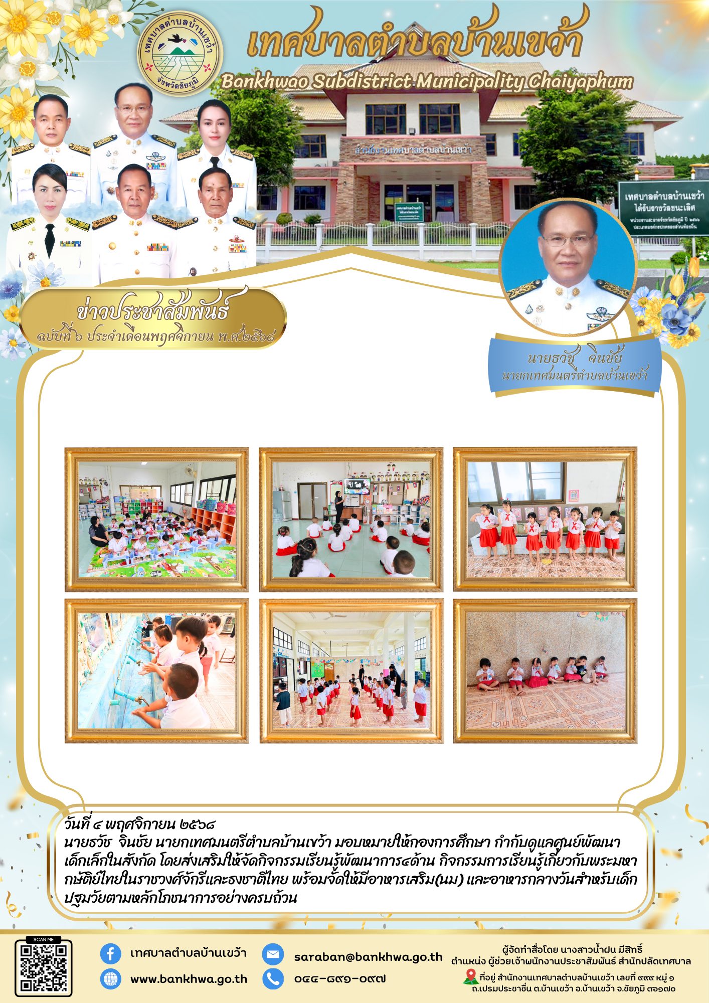 นายธวัช จินชัย นายกเทศมนตรีตำบลบ้านเขว้า มอบหมายให้กองการศึกษา กำกับดูแลศูนย์พัฒนาเด็กเล็กในสังกัด โดยส่งเสริมให้จัดกิจกรรมเรียนรู้พัฒนาการ๔ด้าน กิจกรรมการเรียนรู้เกี่ยวกับพระมหากษัติย์ไทยในราชวงศ์จักรีและธงชาติไทย พร้อมจัดให้มีอาหารเสริม(นม) และอาหารกลางวันสำหรับเด็กปฐมวัยตามหลักโภชนาการอย่างครบถ้วน