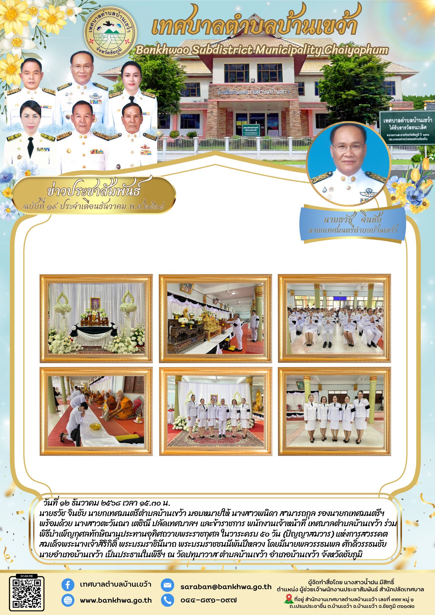 นายธวัช จินชัย นายกเทศมนตรีตำบลบ้านเขว้า มอบหมายให้ นางสาวพนิดา สามารถกุล รองนายกเทศมนตรีฯ พร้อมด้วย นางสาวตะวันณา เตชิณี ปลัดเทศบาลฯ และข้าราชการ พนักงานเจ้าหน้าที่ เทศบาลตำบลบ้านเขว้า ร่วมพิธีบำเพ็ญกุศลทักษิณานุประทานอุทิศถวายพระราชกุศล ในวาระครบ ๕๐ วัน (ปัญญาสมวาร) แห่งการสวรรคตสมเด็จพระนางเจ้าสิริกิติ์ พระบรมราชินีนาถ พระบรมราชชนนีพันปีหลวง โดยมีนายพลวรรธนพล ศักดิ์วรรธนชัย นายอำเภอบ้านเขว้า เป็นประธานในพิธีฯ ณ วัดปทุมาวาส ตำบลบ้านเขว้า อำเภอบ้านเขว้า จังหวัดชัยภูมิ