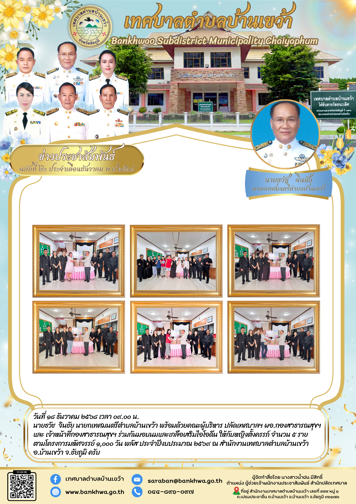 นายธวัช จินชัย นายกเทศมนตรีตำบลบ้านเขว้า พร้อมด้วยคณะผู้บริหาร ปลัดเทศบาลฯ ผอ.กองสาธารณสุขฯ และ เจ้าหน้าที่กองสาธารณสุขฯ ร่วมกันมอบนมและเกลือเสริมไอโอดีน ให้กับหญิงตั้งครรภ์ จำนวน ๕ ราย
