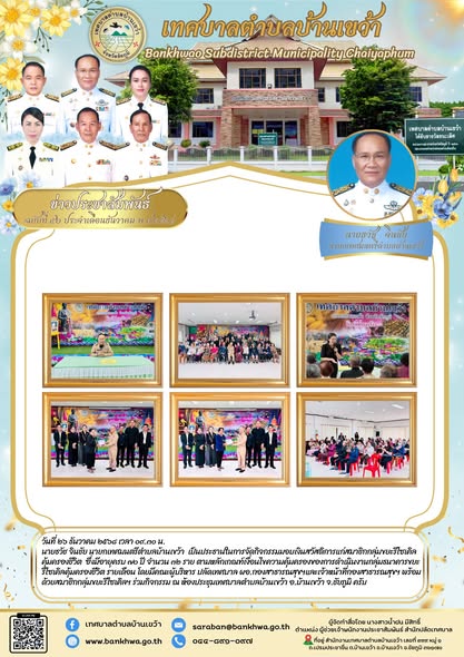 นายธวัช จินชัย นายกเทศมนตรีตำบลบ้านเขว้า เป็นประธานในการจัดกิจกรรมมอบเงินสวัสดิการแก่สมาชิกกลุ่มขยะรีไซเคิลคุ้มครองชีวิต ซึ่งมีอายุครบ ๗๐ ปี จำนวน ๓๒ ราย ตามหลักเกณฑ์เงื่อนไขความคุ้มครองของการดำเนินงานกลุ่มธนาคารขยะรีไซเคิลคุ้มครองชีวิต รายเดือน โดยมีคณะผู้บริหาร ปลัดเทศบาล ผอ.กองสาธารณสุขฯและเจ้าหน้าที่กองสาธารณสุขฯ พร้อมด้วยสมาชิกกลุ่มขยะรีไซเคิลฯ ร่วมกิจกรรม ณ ห้องประชุมเทศบาลตำบลบ้านเขว้า อ.บ้านเขว้า จ.ชัยภูมิ ครับ