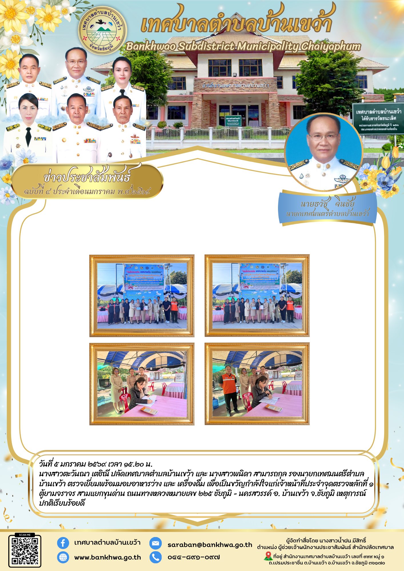 นางสาวตะวันณา เตชิณี ปลัดเทศบาลตำบลบ้านเขว้า และ นางสาวพนิดา สามารถกุล รองนายกเทศมนตรีตำบลบ้านเขว้า ตรวจเยี่ยมพร้อมมอบอาหารว่าง และ เครื่องดื่ม เพื่อเป็นขวัญกำลังใจแก่เจ้าหน้าที่ประจำจุดตรวจหลักที่ ๑ ตู้ยามจราจร สามแยกขุนด่าน ถนนทางหลวงหมายเลข ๒๒๕ ชัยภูมิ - นครสวรรค์ อ. บ้านเขว้า จ.ชัยภูมิ เหตุการณ์ปกติเรียบร้อยดี