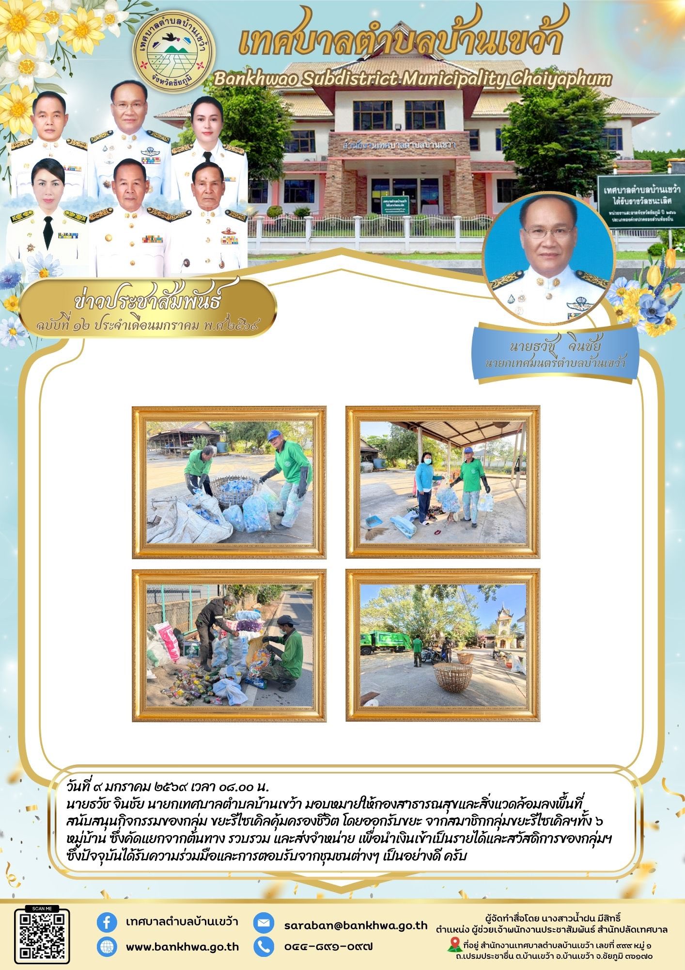 นายธวัช จินชัย นายกเทศบาลตำบลบ้านเขว้า มอบหมายให้กองสาธารณสุขและสิ่งแวดล้อมลงพื้นที่สนับสนุนกิจกรรมของกลุ่ม ขยะรีไซเคิลคุ้มครองชีวิต โดยออกรับขยะ จากสมาชิกกลุ่มขยะรีไซเคิลฯทั้ง ๖ หมู่บ้าน ซึ่งคัดแยกจากต้นทาง รวบรวม และส่งจำหน่าย เพื่อนำเงินเข้าเป็นรายได้และสวัสดิการของกลุ่มฯ ซึ่งปัจจุบันได้รับความร่วมมือและการตอบรับจากชุมชนต่างๆ เป็นอย่างดี ครับ