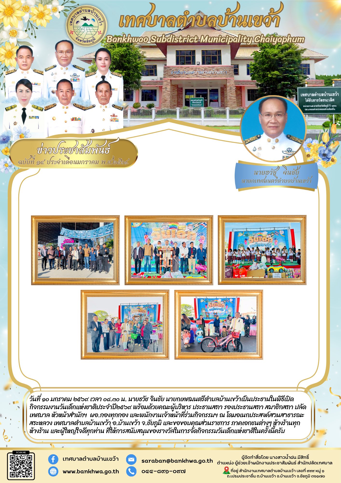 นายธวัช จินชัย นายกเทศมนตรีตำบลบ้านเขว้าเป็นประธานในพิธีเปิดกิจกรรมงานวันเด็กแห่งชาติประจำปี๒๕๖๙ พร้อมด้วยคณะผู้บริหาร ประธานสภา รองประธานสภา สมาชิกสภา ปลัดเทศบาล หัวหน้าสำนักฯ ผอ.กองทุกกอง และพนักงานเจ้าหน้าที่ร่วมกิจกรรมฯ ณ โดมอเนกประสงค์สวนสาธารณะสระหลวง เทศบาลตำบลบ้านเขว้า อ.บ้านเขว้า จ.ชัยภูมิ และขอขอบคุณส่วนราชการ ภาคเอกชนต่างๆ ห้างร้านทุกห้างร้าน และผู้ใหญ่ใจดีทุกท่าน ที่ให้การสนับสนุนของรางวัลในการจัดกิจกรรมวันเด็กแห่งชาติในครั้งนี้ครับ
