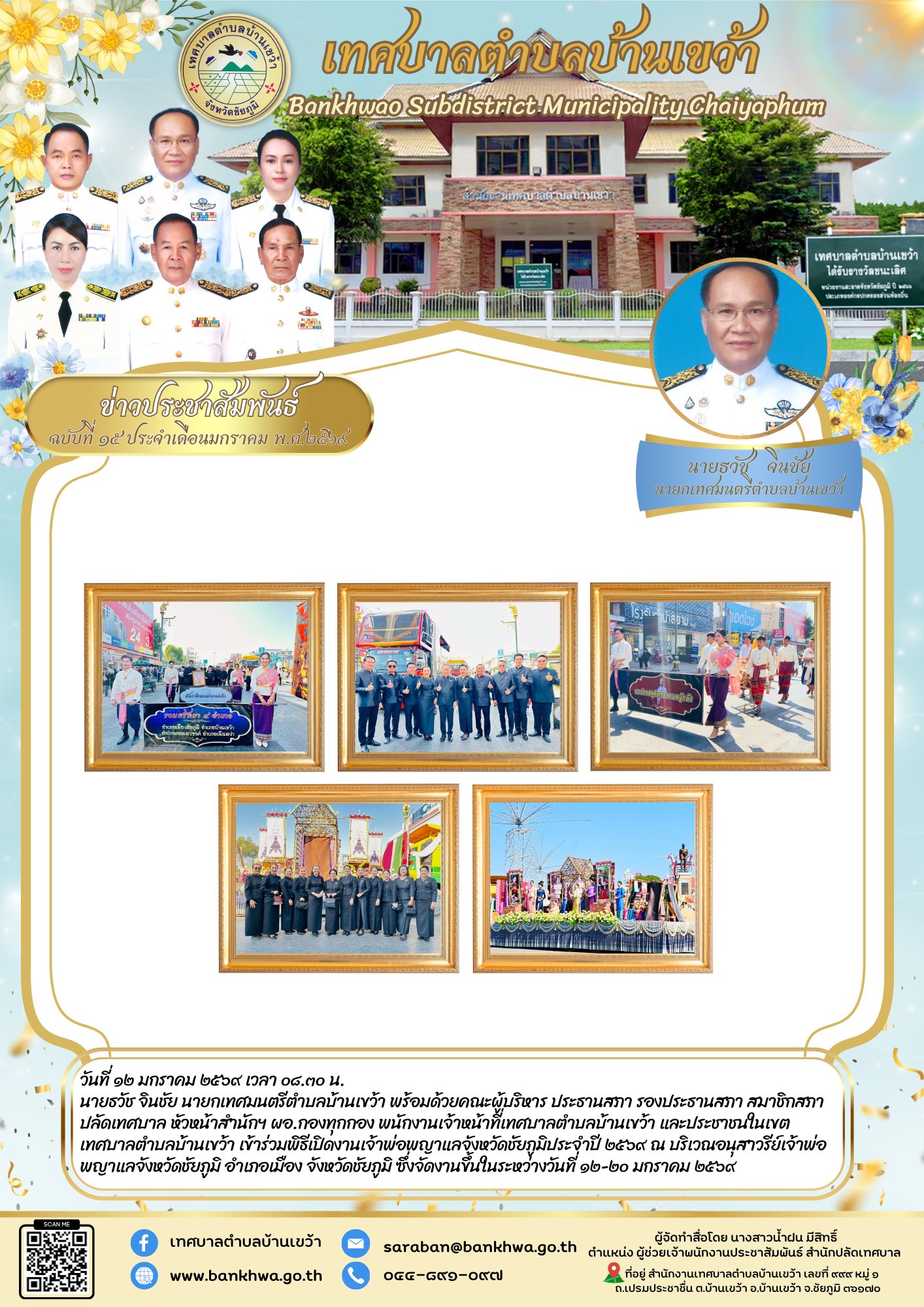 นายธวัช จินชัย นายกเทศมนตรีตำบลบ้านเขว้า พร้อมด้วยคณะผู้บริหาร ประธานสภา รองประธานสภา สมาชิกสภา ปลัดเทศบาล หัวหน้าสำนักฯ ผอ.กองทุกกอง พนักงานเจ้าหน้าที่เทศบาลตำบลบ้านเขว้า และประชาชนในเขตเทศบาลตำบลบ้านเขว้า เข้าร่วมพิธีเปิดงานเจ้าพ่อพญาแลจังหวัดชัยภูมิประจำปี ๒๕๖๙ ณ บริเวณอนุสาวรีย์เจ้าพ่อพญาแลจังหวัดชัยภูมิ อำเภอเมือง จังหวัดชัยภูมิ ซึ่งจัดงานขึ้นในระหว่างวันที่ ๑๒-๒๐ มกราคม ๒๕๖๙