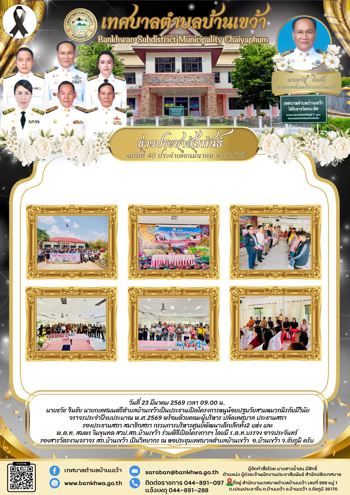 นายธวัช จินชัย นายกเทศมนตรีตำบลบ้านเขว้าเป็นประธานเปิดโครงการหนูน้อยปฐมวัยสวมหมวกนิรภัยมีวินัยจราจรประจำปีงบประมาณ พ.ศ.2569 พร้อมด้วยคณะผู้บริหาร ปลัดเทศบาล ประธานสภา รองประธานสภา สมาชิกสภา กรรมการบริหารศูนย์พัฒนาเด็กเล็กทั้ง2 แห่ง และ พ.ต.ท. สมพร งิมขุนทด สวป.สภ.บ้านเขว้า ร่วมพิธีเปิดโครงการฯ โดยมี ร.ต.ท.บรรจง อาจประจันทร์ รองสารวัตรงานจราจร สภ.บ้านเขว้า เป็นวิทยากร ณ หอประชุมเทศบาลตำบลบ้านเขว้า อ.บ้านเขว้า จ.ชัยภูมิ ครับ