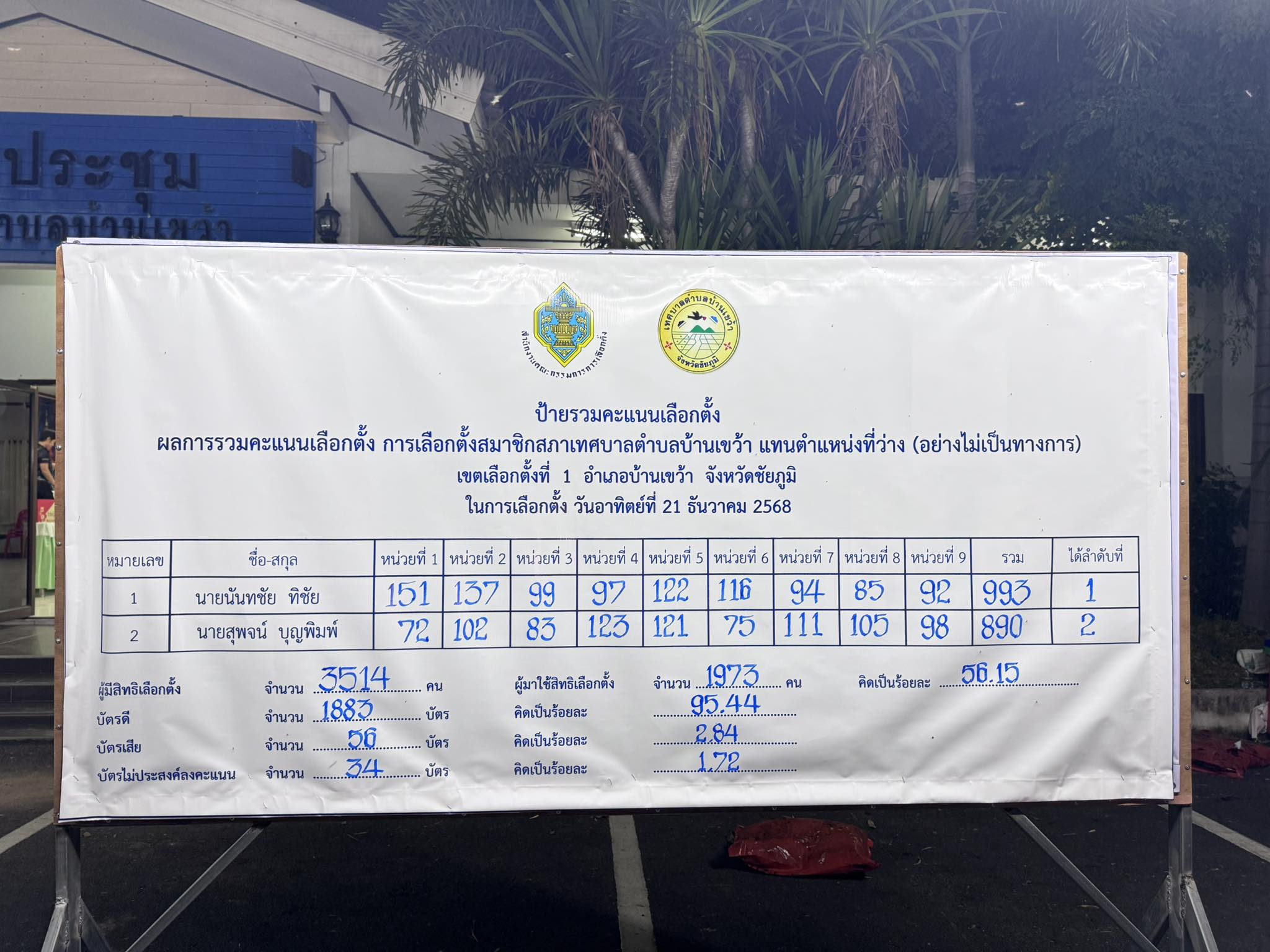 ประกาศและแจ้งผลการรวมคะแนนเลือกตั้ง “การเลือกตั้งสมาชิกสภาเทศบาลตำบลบ้านเขว้า แทนตำแหน่งที่ว่าง ”เขตเล...