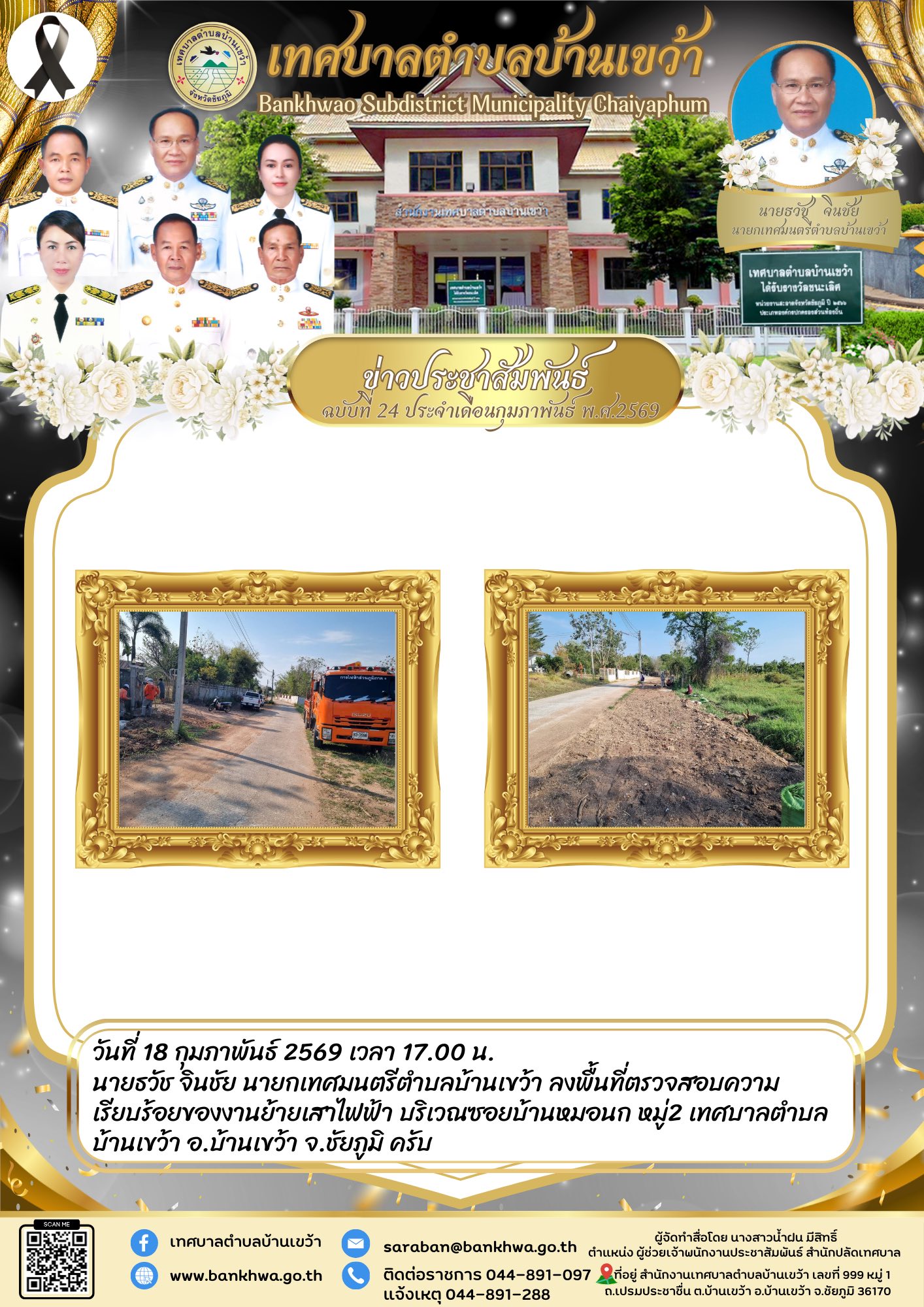 นายกเทศมนตรีตำบลบ้านเขว้า ลงพื้นที่ตรวจสอบความเรียบร้อยของงานย้ายเสาไฟฟ้า...