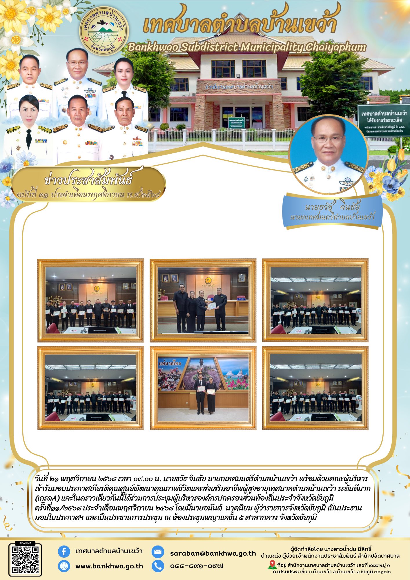 คณะผู้บริหาร เข้ารับมอบประกาศเกียรติคุณศูนย์พัฒนาคุณภาพชีวิตและส่งเสริมอาชีพผู้สูงอายุเทศบาลตำบลบ้าน�...