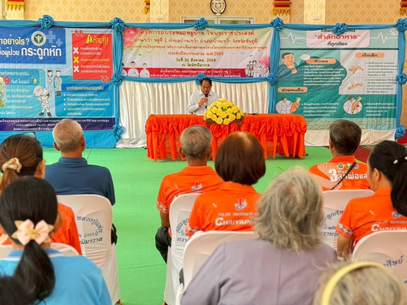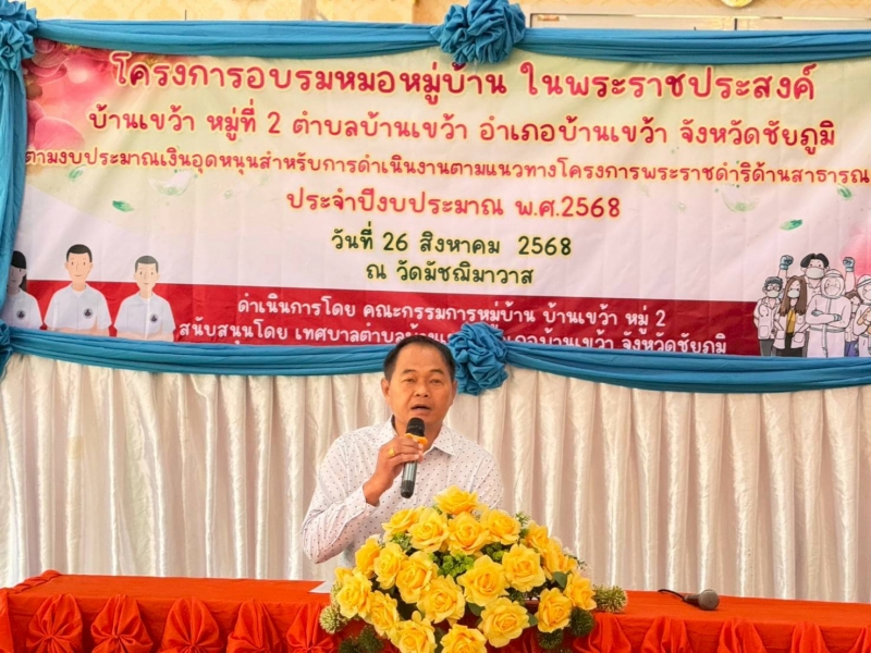 นายธวัช จินชัย นายกเทศมนตรีตำบลบ้านเขว้า มอบหมายให้ นายศุภวิชญ์ อ่อนเขว้า รองนายกเทศมนตรีฯ เป็นประธานเปิดโครงการตามแนวพระราชดำริด้านสาธารณสุขประจำปี ๒๕๖๘ โครงการอบรมหมอหมู่บ้าน ในพระราชประสงค์ บ้านเขว้า หมู่ ๒ โดยมีคณะบริหารผู้บริหาร สมาชิกสภาฯ ปลัดเทศบาล ผอ.กองสาธารณสุขฯ เข้าร่วมพิธีเปิดโครงการฯ ณ วัดมัชฌิมาวาส หมู่ ๒ เทศบาลตำบลบ้านเขว้า อ.บ้านเขว้า จ.ชัยภูมิ