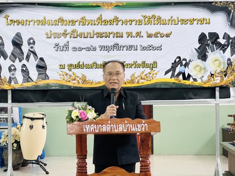 นายธวัช จินชัย นายกเทศมนตรีตำบลบ้านเขว้า เป็นประธานเปิดโครงการส่งเสริมอาชีพเพื่อสร้างรายได้ให้แก่ประชาชนประจำปีงบประมาณ พ.ศ.๒๕๖๙ (ทำเข็มกลัดโบว์ดอกไม้ติดหน้าอก) โดยมีคณะผู้บริหาร สมาชิกสภาฯ ปลัดเทศบาลฯ และเจ้าหน้าที่กองสวัสดิการสังคม ร่วมเปิดโครงการฯ ณ ศูนย์ส่งเสริมผ้าไหมจังหวัดชัยภูมิ