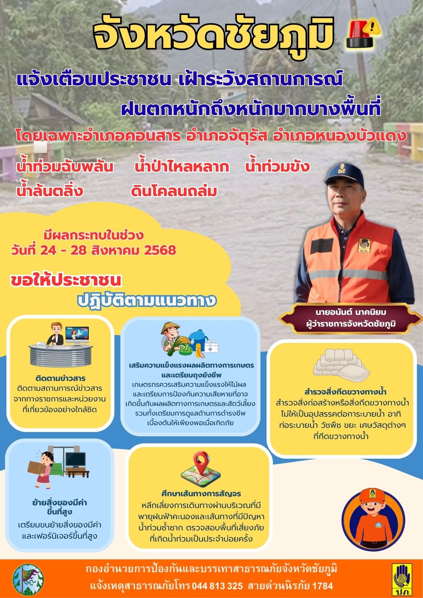 จังหวัดชัยภูมิ แจ้งเตือนประชาชนเฝ้าระวังสถานการณ์ฝนตกหนักในบางพื้นที่ ในวันที่ 24-28 ส.ค.2568 นี้