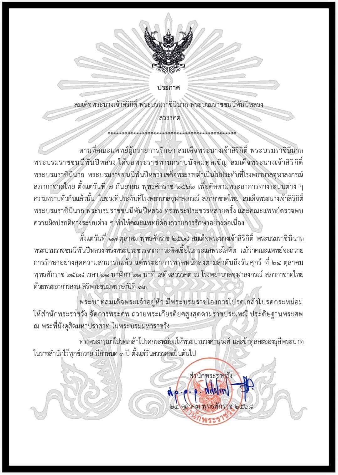 สำนักพระราชวัง เผยแพร่ประกาศ สมเด็จพระนางเจ้าสิริกิติ์ พระบรมราชินีนาถ พระบรมราชชนนีพันปีหลวง สวรรคต