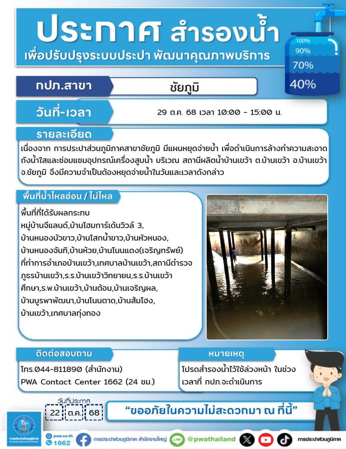 กปภ.สาขาชัยภูมิ ประกาศแจ้งสำรองน้ำ
